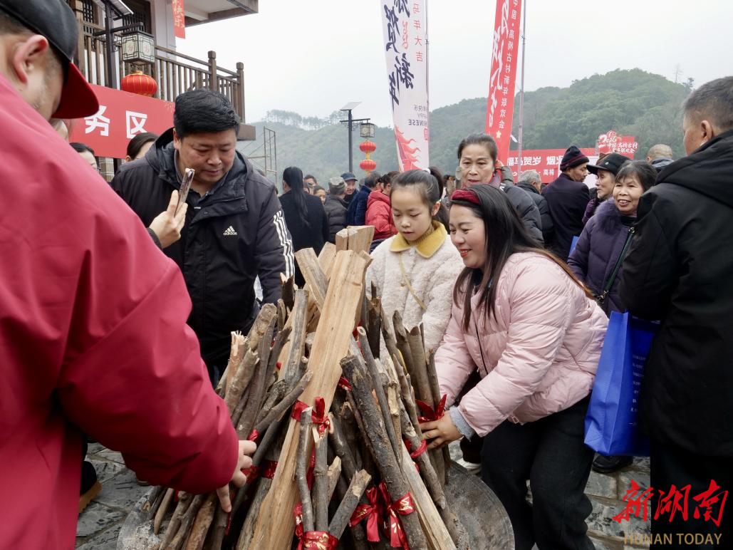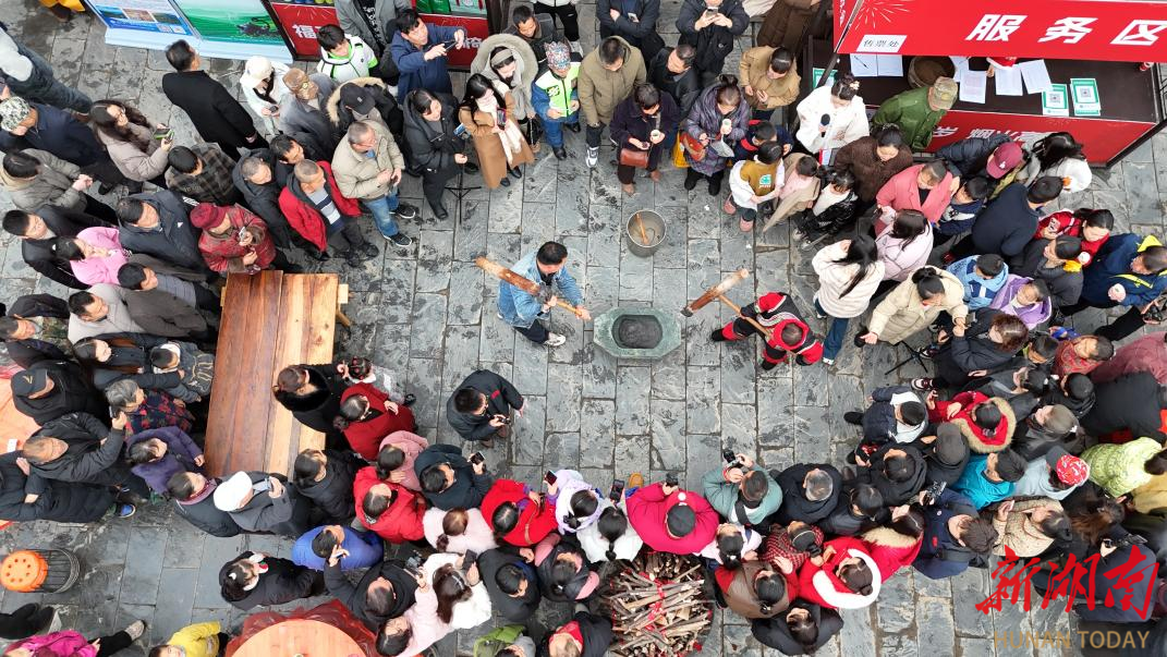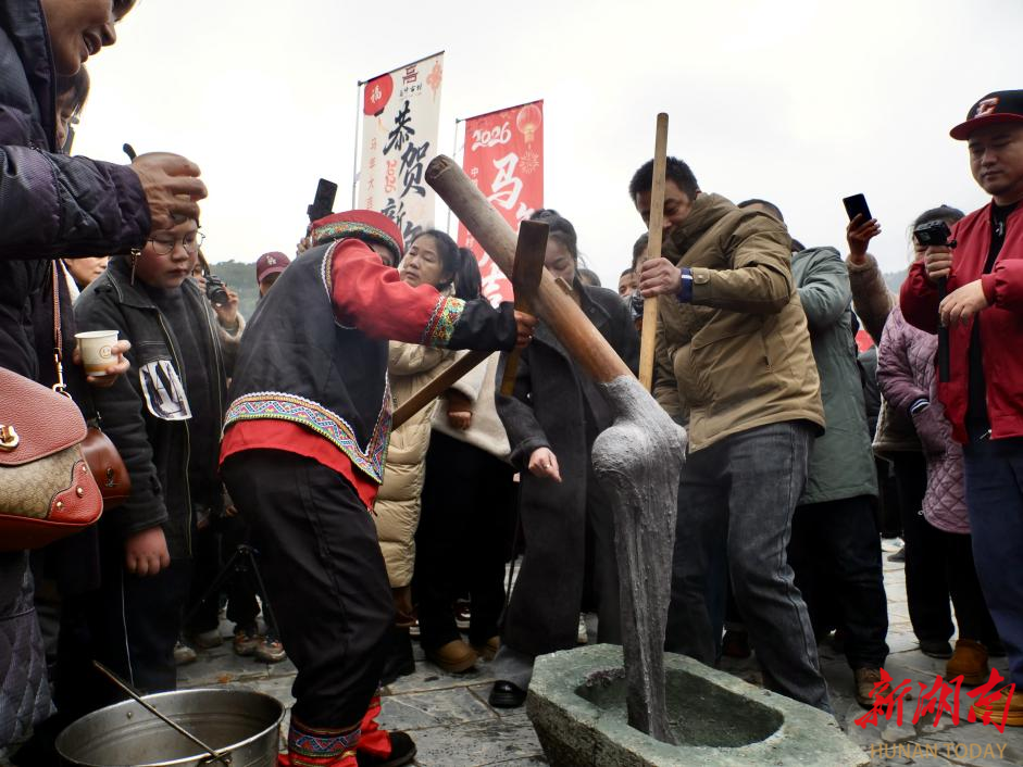 新年的仪式感,藏在最质朴的民俗里。添柴加薪祈福,游客执柴入火塘,一句“岁岁红火”,把新年期盼烧得滚烫;杀年猪、庖汤宴轮番开场,游客与村民围坐一桌,热汤暖胃,笑语暖心,这是童年里最真切的年的模样。“从浙江带娃赶来,打糍粑、看表演、吃庖汤,这才是过年该有的热闹!”浙江游客杨庆抱着孩子,满眼都是幸福。