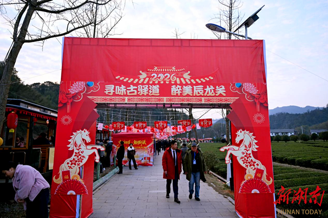 从会仙桥到“村晚”主会场会元桥广场的茶园小道上,沿街建筑上大红灯笼高高挂,村民家也都贴上新春对联和福字。年货集市不仅能品尝碣滩贡茶、蒿子粑粑、乡里腊肉等土特产和美食,还能体验磨豆腐、打糍粑、竹竿舞等传统民俗的乐趣。