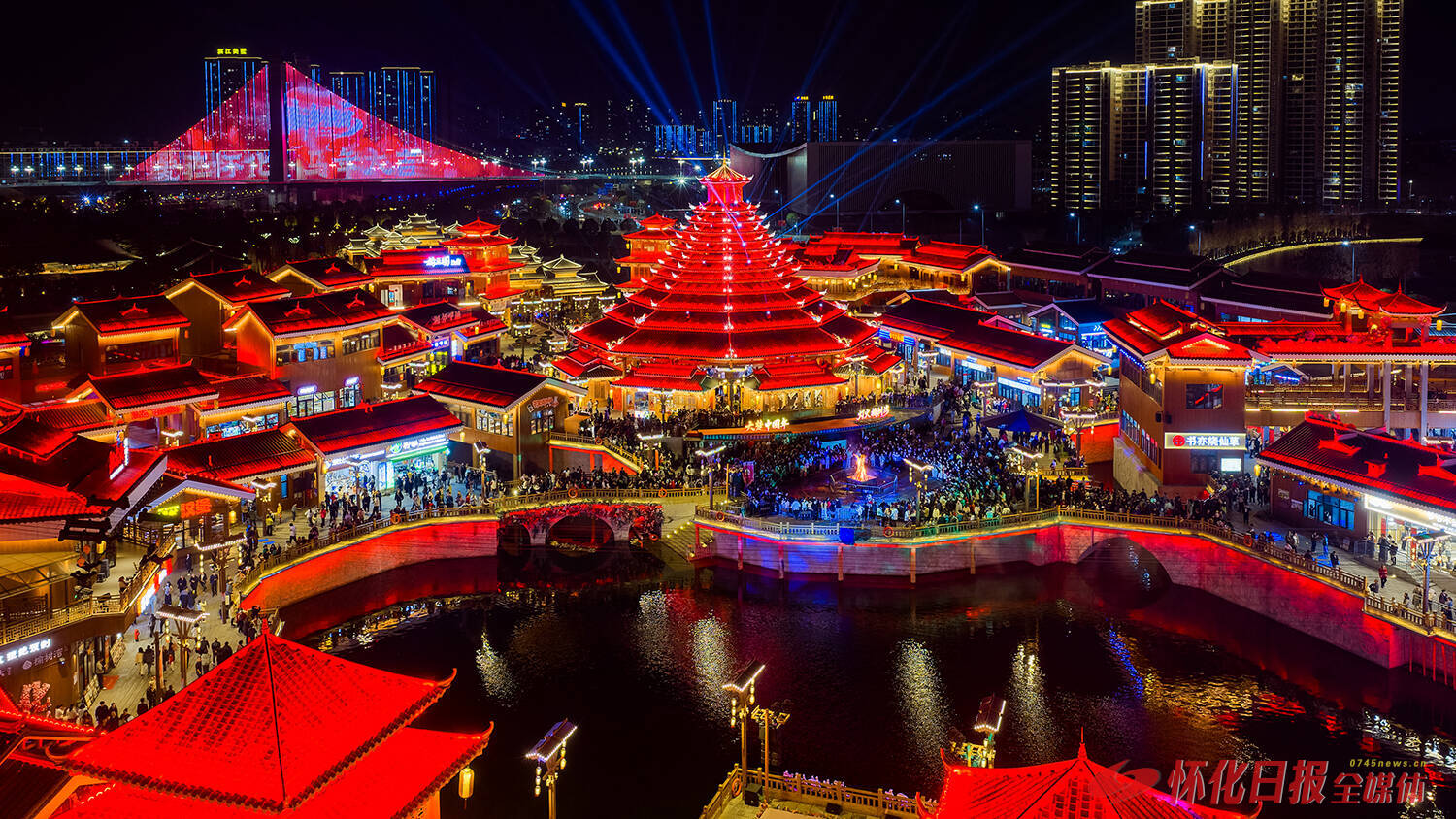 2月15日晚,榆树湾文旅商综合体灯光璀璨、人流如织,一场迎新春文旅活动举行。雪峰鼓楼光影惊艳亮相,㵲水河畔灯光璀璨。春节期间,当地将轮番上演涵盖“神骏迎福”新春游园会、非遗展演、楚韵贺岁、龙狮闹春、非遗喷火、打铁花、鱼灯巡游、篝火晚会等丰富多彩的内容,打造一场全景式喜迎新春的文旅盛宴。(田文国 摄)