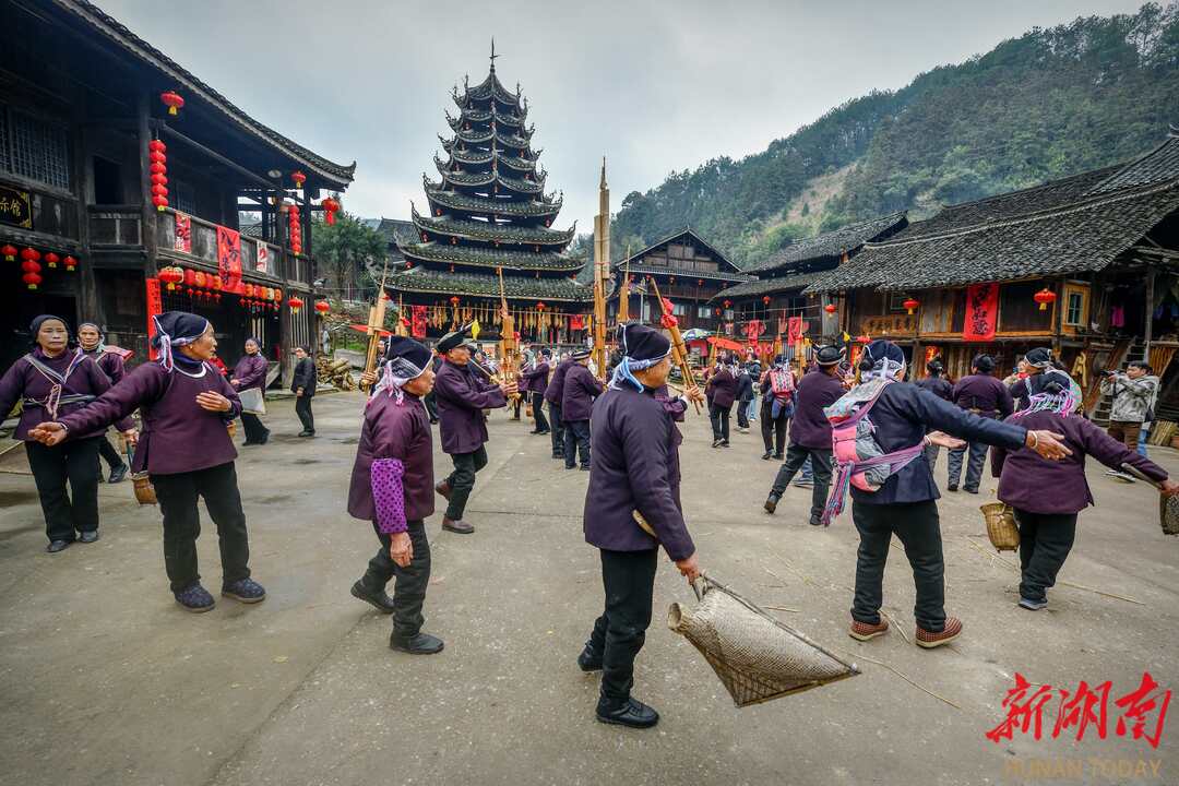 作为侗乡人民一项历史悠久的新春传统文化活动,“闹春牛”生动再现了侗族群众春耕春种的劳动场景。今年的活动现场,村民们身着绚丽多彩的侗族传统服饰,舞动着篾篓、稻草,扛着犁耙、竹条等农具,敲响铿锵的锣鼓,吹起悠扬的芦笙。在欢腾的乐声中,大家“赶”着由竹篾彩布精心扎制的“春牛”,浩浩荡荡地从古老的寨门出发,沿着村寨的石板路巡游。