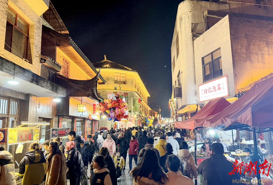 夜色渐浓,古城灯笼次第亮起,暖黄的光晕将石板路映得温润柔和。黔阳竹编、棕编等非遗体验活动持续开展,各项精彩民俗表演轮番上演,与古城万家灯火交相辉映、融为一体,尽显新春夜的烟火与雅致。