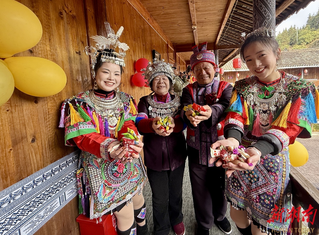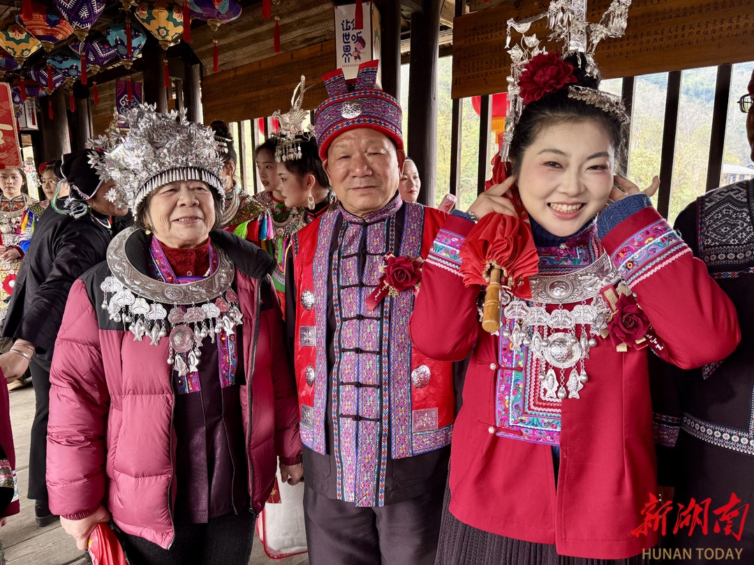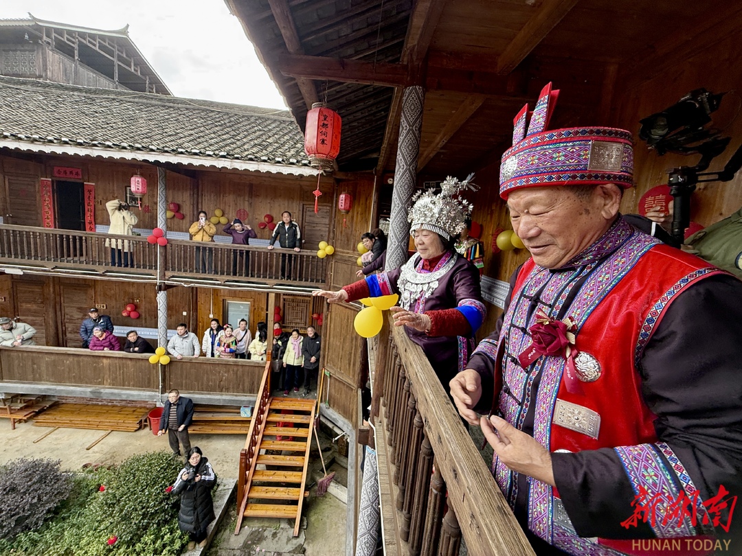 2月19日,通道侗族自治县皇都侗民族文化村,一对来自江西宜春市的游客夫妻,沉浸式体验了侗族婚礼秀,在侗寨感受金婚之乐。当天,该村举行“行歌坐夜·情定侗乡”侗族婚俗活动,游客参与其中,感受接亲、走寨、打糍粑等独特的侗族文化魅力。(通讯员 陈俊宇 摄)