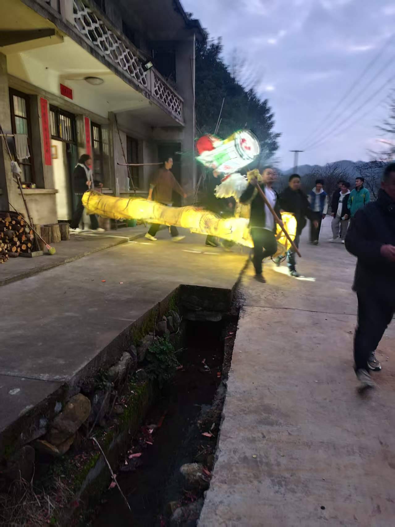 “龙灯进屋亮堂堂,今晚特来贺新春,新春新春,五谷丰登,四季平安好运长,千年发达万年兴……”这是大年初三溆浦县黄茅园镇金中村的一户农家正在上演龙灯进屋贺喜的热闹场景。一条长龙盘旋在农家堂屋里面,龙头对着神龛,龙灯队员说着吉祥话,说一句吉祥话,众人呼喊一声“好高”,吉祥话一声高过一声,热闹一浪高过一浪,说完吉祥话,主人家会拿出提前准备的红包感谢龙灯队,这时龙灯队从堂屋出来,在院子里还会表演一番,龙灯忽高忽低、忽左忽右,前后左右来回穿插,宛如一条巨龙在不停翻滚,同时鞭炮声响彻院子。