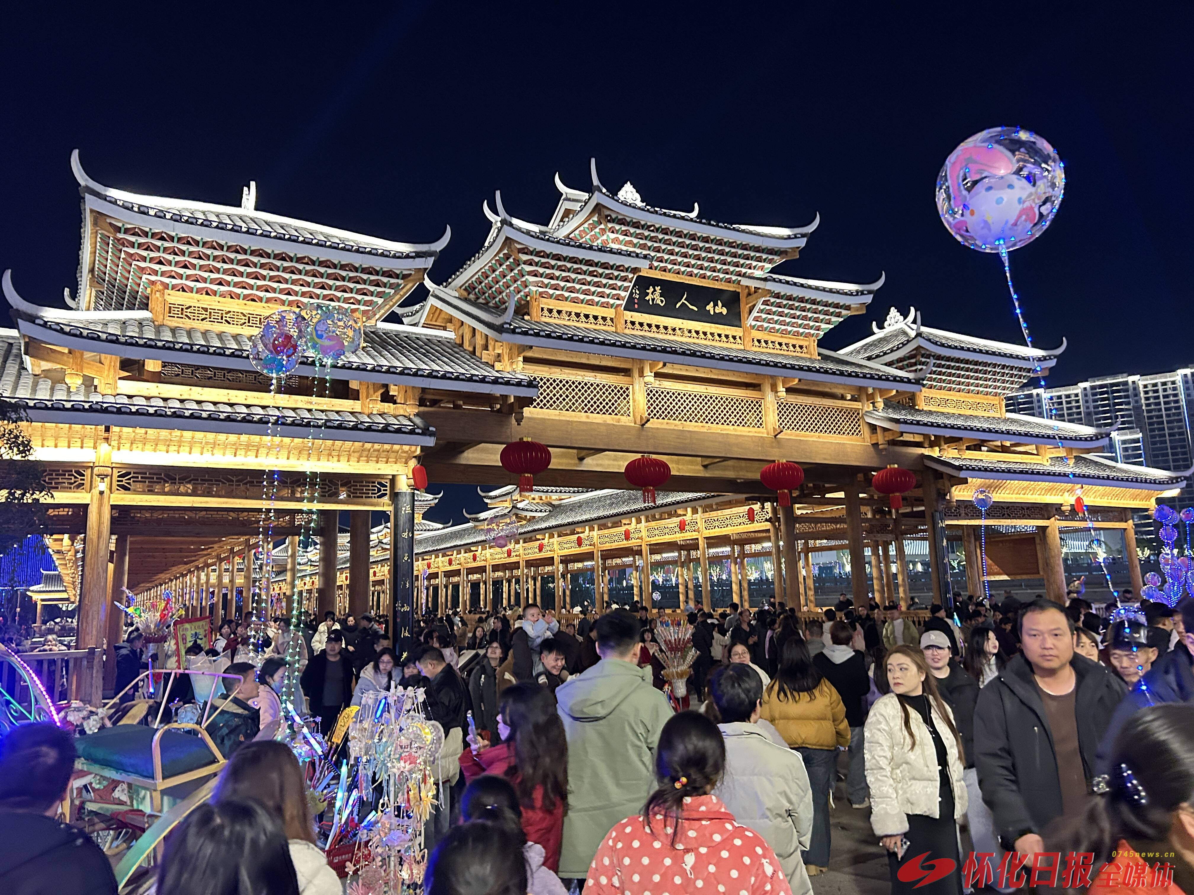 核心片区引爆消费市场。以鹤城区榆树湾为核心的“三江一湾”区域,依托旅发大会建成的夜游亮化、光影演艺、沉浸式街区、非遗市集、东盟风情体验等优质业态,成为春节游客首选目的地与消费主战场。“三江一湾”沿线纳入智慧文旅平台监测的旅游区17家,春节期间累计客流149.84万人次,占全市监测基层单位总客流的62.63%,城市文旅新地标效应持续放大。同时,打造推出“三江一湾·人间烟火游”“神韵雪峰·云端花瑶游”“最美侗寨·侗苗风情游”“寿乡汤泉·休闲康养游”“中华书山·新年文化行”五大主题线路,串联核心景区、文化场馆、古村古镇与特色街区,形成“一线串珠,全域开花”产品格局,有效引导游客跨区域流动、深度化游览。