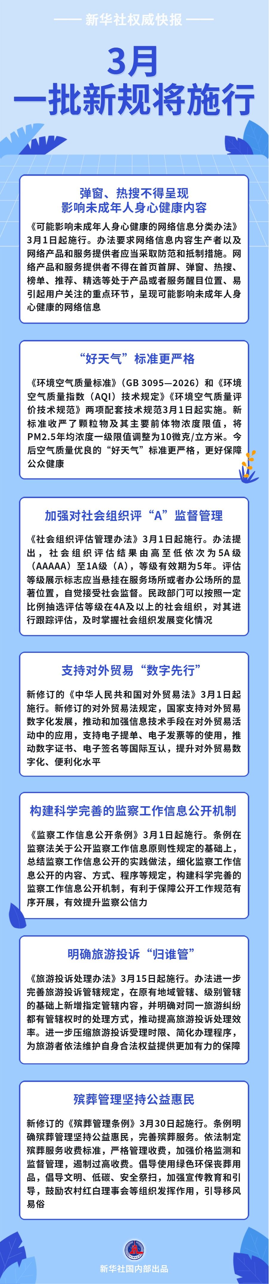 首页首屏、弹窗热搜等不得呈现影响未成年人身心健康的网络信息;“好天气”标准更严格,更好保障公众健康;加强对社会组织评“A”监督管理……3月,一批新规将施行,一起来看!