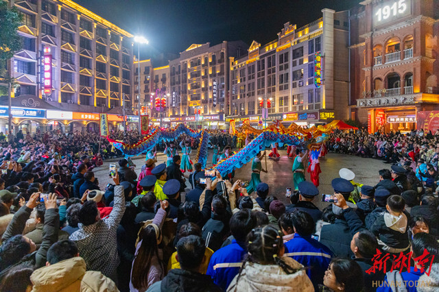 晚上7时,“元宵喜送龙”活动拉开帷幕。夜色中,27支龙队从城区各处出发,沿着街巷向洪江区体育广场汇聚,所到之处,便是一片欢乐的海洋。早已在新民路传统风情街等候的游客和市民,纷纷参与“摸龙”“钻龙”“扯龙”互动,期盼新年走鸿运。