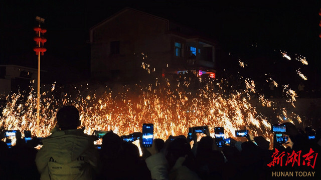 在文艺展演中,国家级非物质文化遗产辰河高腔的经典选段登台亮相,让现场观众沉浸式感受传统艺术的独特魅力。舞龙舞狮则将辰溪延续千年的龙文化展现得淋漓尽致,也彰显出辰溪人民昂扬向上的奋斗精神。机器狗表演,让科技感与年味交融,瞬间点燃现场氛围。非遗打铁花表演更是将活动推向高潮,铁水化作万千金色光点腾空绽放,如星河坠落、火树银花。