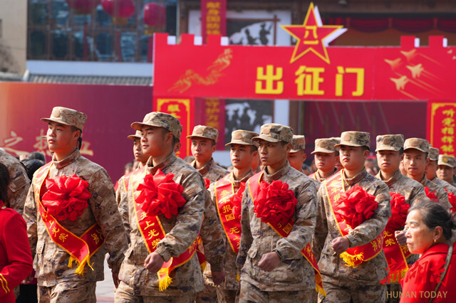 活动最后,新兵们踏着整齐的步伐,昂首走过出征门,在全民送行的尊崇氛围中,怀揣家乡父老的嘱托与期望,踏上保家卫国的新征程。